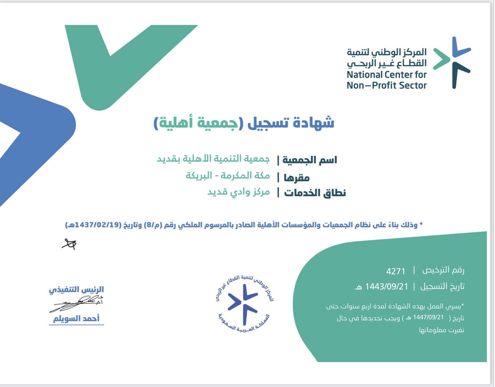 منذ أن انطلقت جمعية التنمية الأهلية بقديد بمنطقة مكة المكرمة وقد أخذت على عاتقها خدمة هذا الوطن المعطاء وكان شعارها الذي كان وما زال نبراسا لجميع العاملين (سعي دؤوب لعمل فريد) ونحن نعي ان هذه القاعدة تحتاج الي مزيد من العمل والجهد والعطاء للوصول الي رؤيتنا التي اطلقنها (أن نكون إنموذجا لجمعية اجتماعية رائدة ومتميزة) من هنا تأسست جمعية التنمية الأهلية بقديد التابعة لمحافظة خليص و بموافقة من وزارة الموارد البشرية والتنمية الإجتماعية.